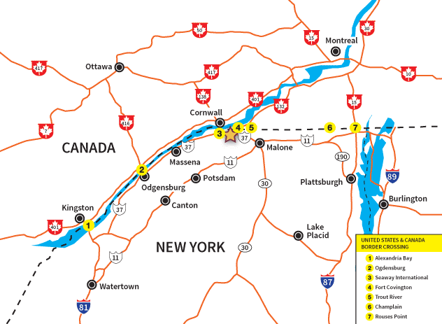 - Champlain Crossing at Champlain, NY/ St Bernard de Lacolle, QC is 1 hour 20 minutes to Casino. (no bridge, toll-free)